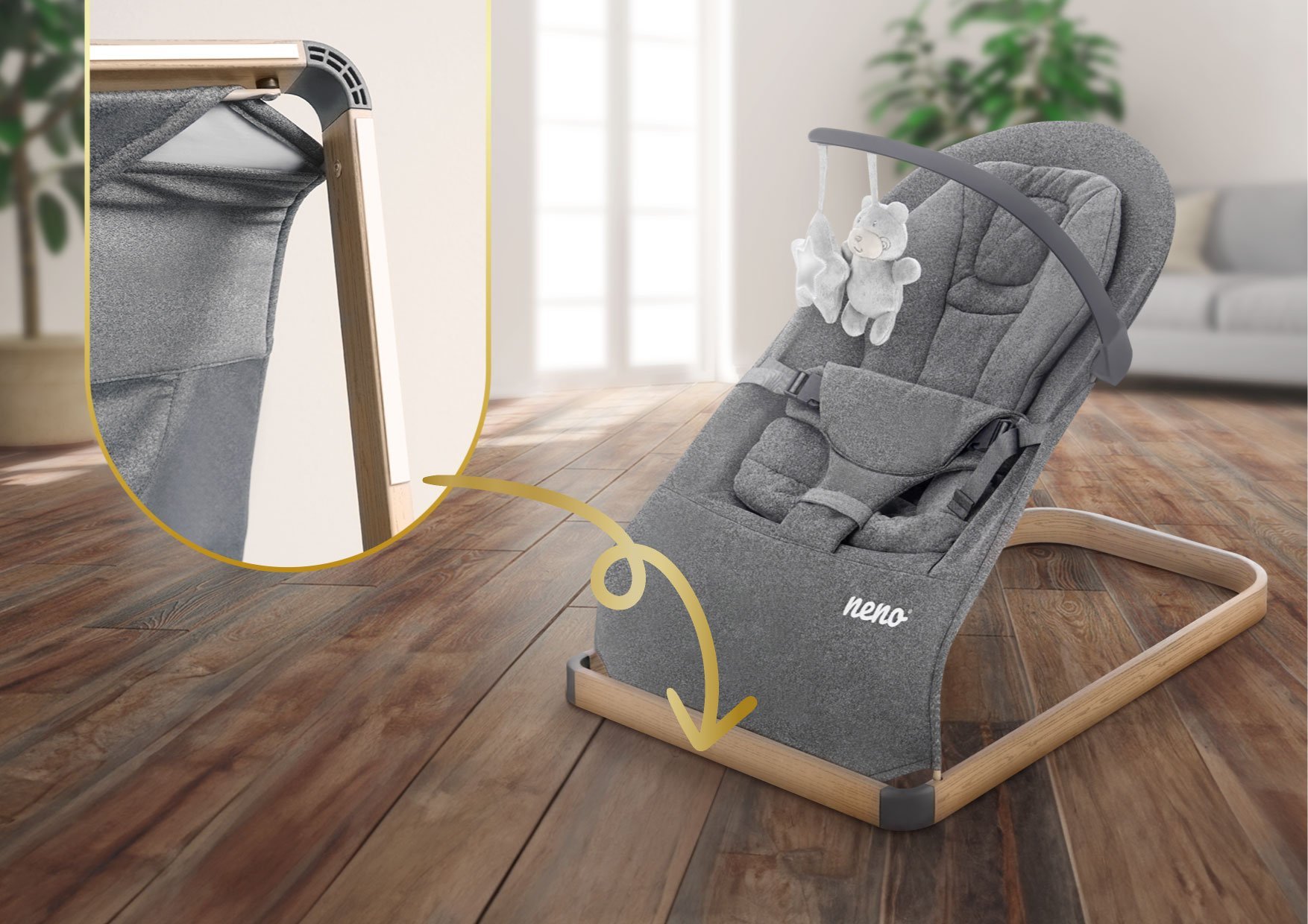 Neno Chiaro będzie wszędzie tam, gdzie go potrzebujesz. Leżaczek jest na tyle lekki, że z łatwością przeniesiesz go z pomieszczenia do pomieszczenia.