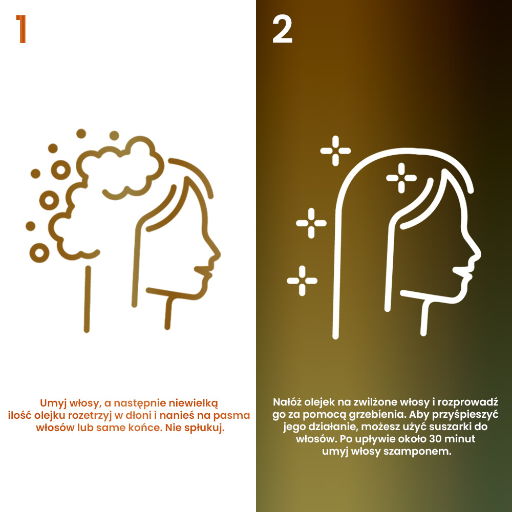 Umyj włosy, a następnie niewielką ilość olejku rozetrzyj w dłoni i nanieś na pasma włosów lub same końce. Nie spłukuj.